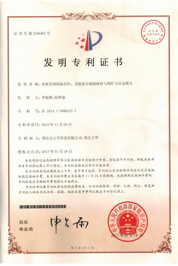重慶安吉升專(zhuān)利:水泥發(fā)泡保溫芯料、無(wú)機(jī)復(fù)合保溫板材與制作方法及模具 CN104478354B 發(fā)明專(zhuān)利 公告日期2017-01-18